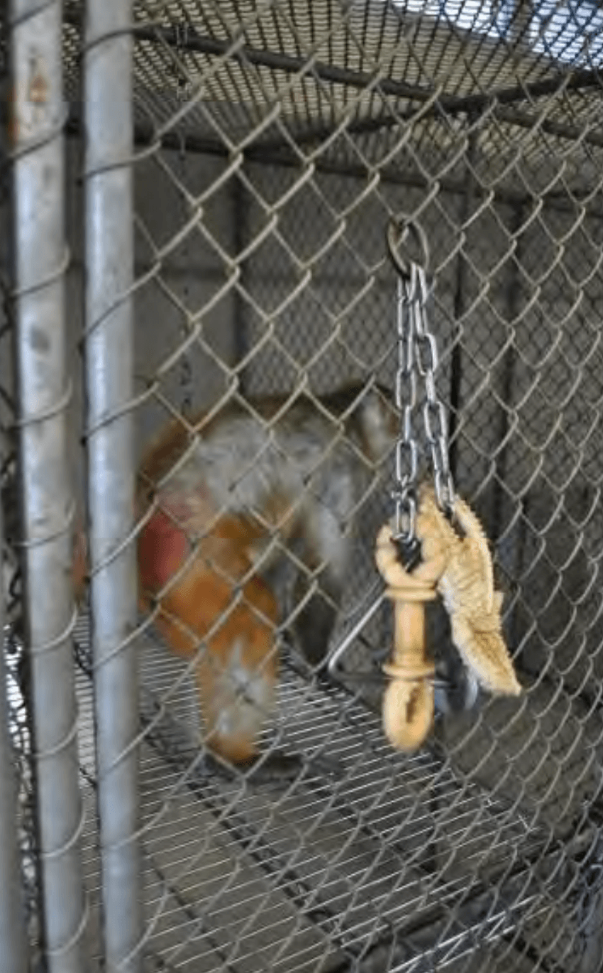 Otro mono, solo en una jaula metálica inhóspita, también tiene pérdida de pelo a lo largo de la espalda y se extiende hasta las piernas.