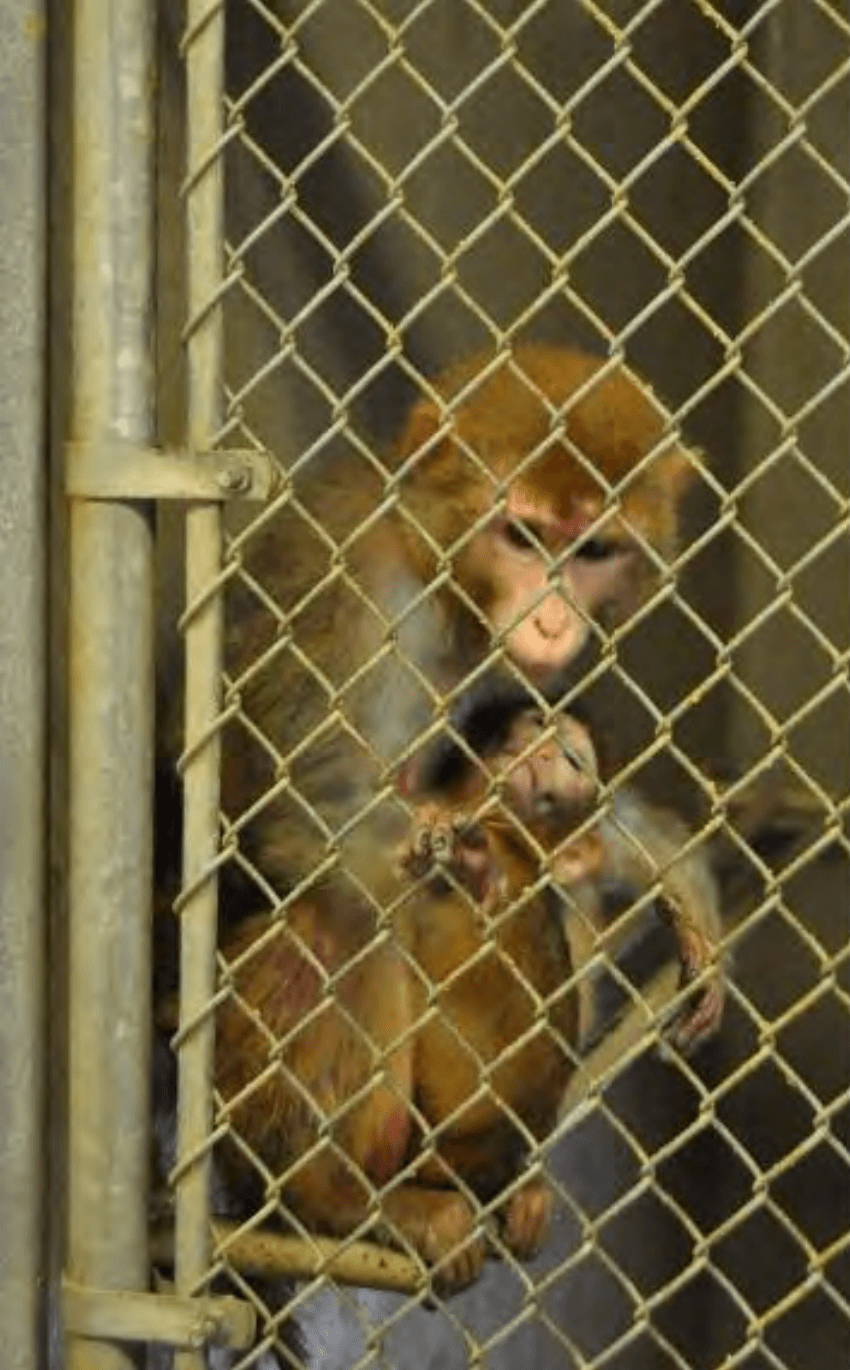 Esta es otra foto de la mona y su bebé, ambos sufriendo de alopecia severa, algo que aparentemente ignoró JHU. No había un plan de tratamiento para ninguno de los monos.