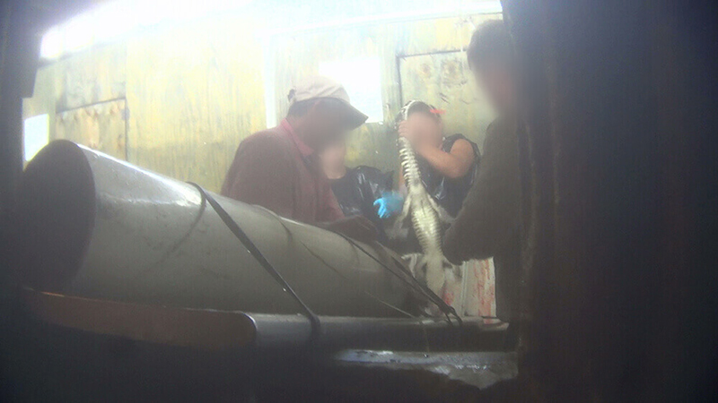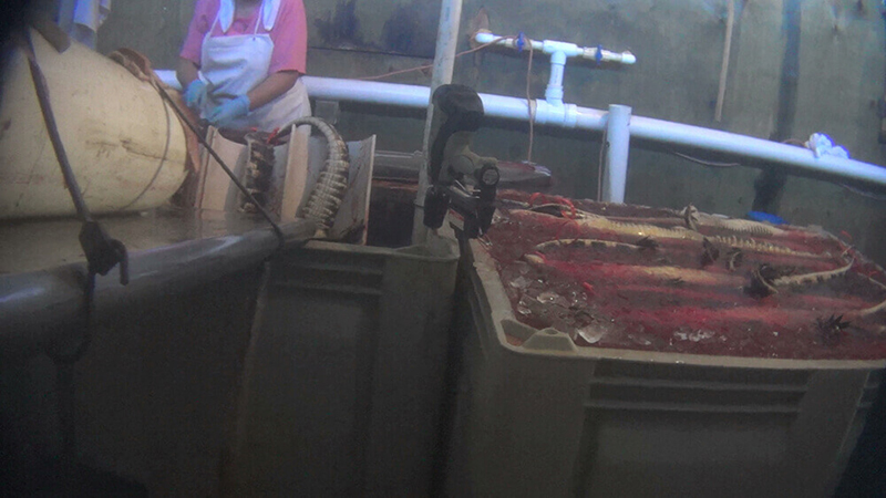 Un trabajador lleva a los caimanes que cortaron y desangraron brevemente a un recipiente de agua helada. El investigador de PETA vio que algunas colas y extremidades de algunos animales continuaban moviéndose dentro del agua.