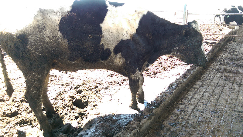Las vacas – más de 10.000 de las cuales pueden mantenerse en las instalaciones de acuerdo con el permiso de la granja – están confinadas en galpones enormes. El denunciante documentó que las vacas son obligadas a estar de pie y a recostarse sobre sus propios deshechos. Algunos de los animales grabados en el video están tan sucios que apenas puedes ver de qué color son.