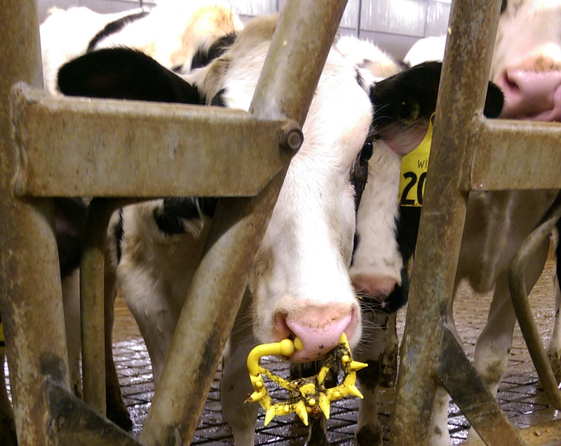 A algunos becerros les colocan anillos con picos en las fosas nasales para evitar que traten de amamantarse de otros becerros.